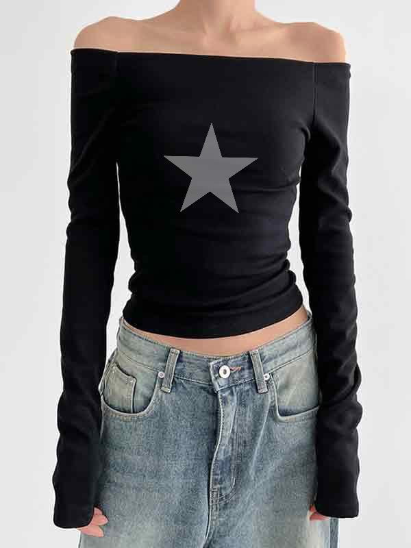 One Shoulder Fake Two Piece Print Long Sleeve Tee
