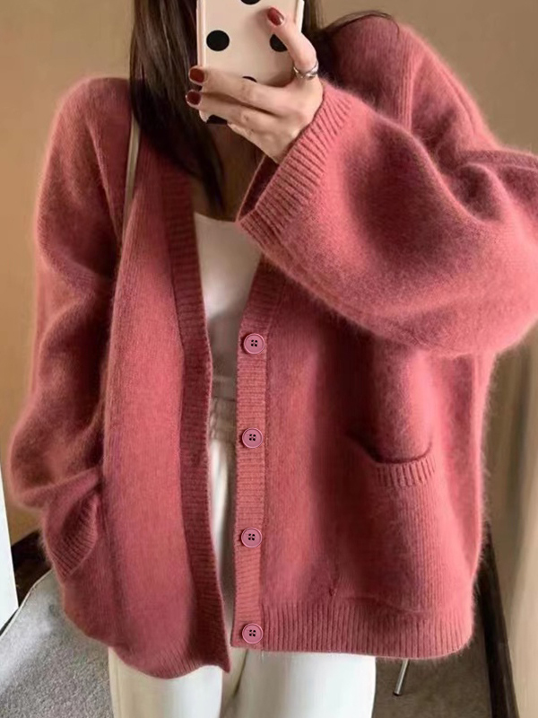 Solid V Neck Loose Knit Cardigan
