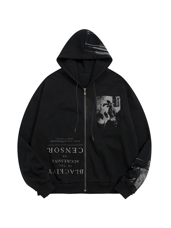 Vintage Cross Rhinestone Print Zip Up Oversized Hoodie