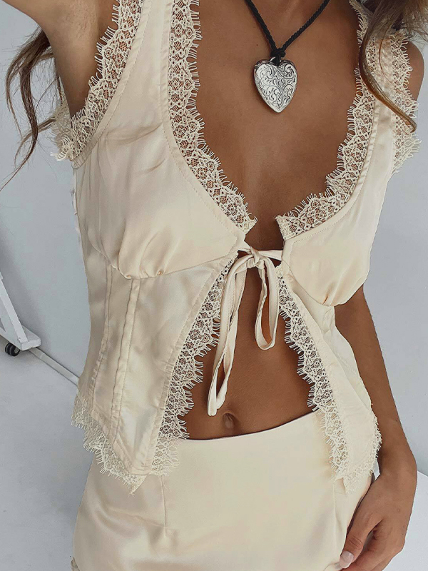 Lace Trim Splice Tie Front Tank Top